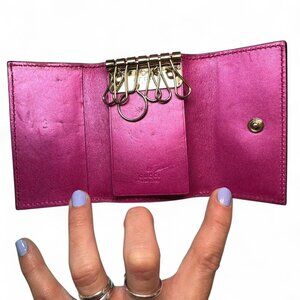 This stylish key holder is crafted of Gucci GG monogram-embossed patent leather in metallic pink, with a light brass heart-shaped Gucci GG logo on the front. The case opens to a metallic pink leather interior with six light brass key rings.