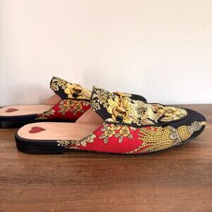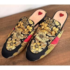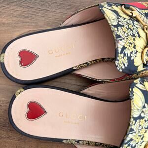 Step into statement luxury with these Gucci Princetown mules—an iconic silhouette reimagined in elaborate dragon-scale brocade. Woven in rich gold, black, and crimson tones, the upper features a mythical floral motif that evokes both heritage and high fashion. Finished with Gucci’s signature gold-tone horsebit hardware and a heart-detailed insole, these slip-ons are equal parts art and indulgence.