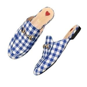GUCCI Princetown White and Blue Gingham Loafer Mules Size 37.5