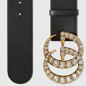 Embedded crystal stones give the Double G a sparkling effect, following the shape of the House's signature emblem presented with an antiqued gold finish. Placed on a wide leather belt that can be worn at the waist or hips.