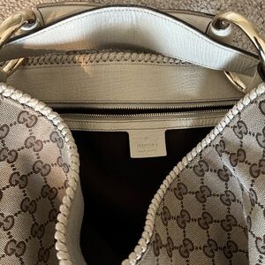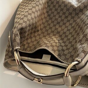 Gucci satchel with horse bit brass & leather handle; Leather piping embellished. 1 inner pocket. Sand/Beige/Taupe colored.