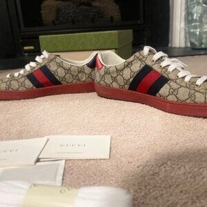 Gucci sneakers in good condition, worn 4 times. I can't style them like I need too therefore they are not being worn like they should be. These are a size Gucci 8 which fits a US size 9.