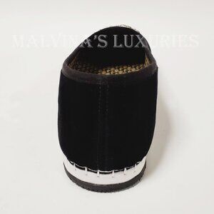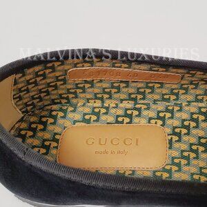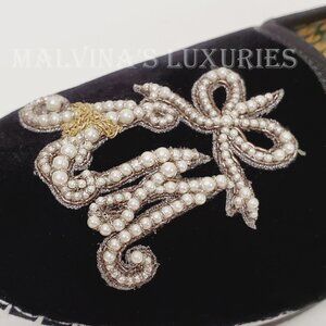 Unique Features: Velvet Loafer / Moccasin features Pearl effect beaded "AM" applique that stands for initials of Gucci's creative director, Alessandro Michele. Plush Black velvet with grosgrain trim. Resin pearl beads and metallic threads. Printed Logo Lining. Signature Rubber Sole.