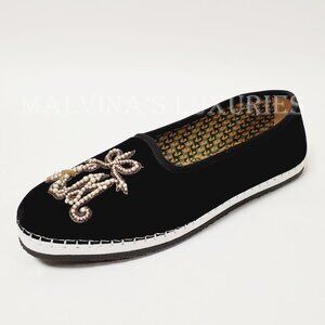 GUCCI SHOES BLACK VELVET MOCCASIN LOAFERS PEARL AM APPLIQUE FLATS sz 36.5 6.5