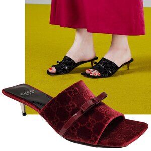 Unique Features: Feminine pair of slides features mid heel and square toeline. Crafted from luxurious velvet, this design is adorned with tonal leather bow detail. GG Logo Velvet. Square Toe. Patent Leather Bow. Stiletto Heel.