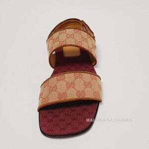 Unique Features: Gucci - Gucci's beige and brick red Senior sandals evoke an emblematic mood for the warmer months. Expertly crafted in Italy cut to a square-toe silhouette, they have GG Supreme canvas straps piped in tan suede and a wide Velcro-fastening band at the ankle, then are lined in rich burgundy woven with tiny GG motifs.