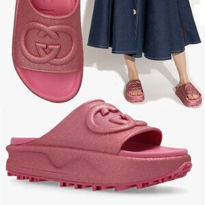 Unique Features: 'Miami' GG-Embossed Glittered Rubber Platform Slides. Lean into the '90s with these chunky pink slides shaped from glitter effect rubber and set on a chunky platform sole.