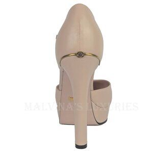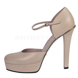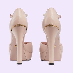 Unique Features: Interlocking G Logo motif adorns the high heel of this beautiful pink leather pumps. Antique gold hardware detail on the heel. Signature buckle, adjustable ankle strap. High heel (approx 4.7" with 1" platform).