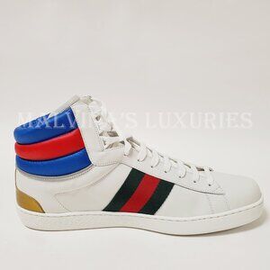 GUCCI SNEAKERS MENS ACE HIGH TOP WHITE LEATHER WEB STRIPE SHOES sz 10G 10.5