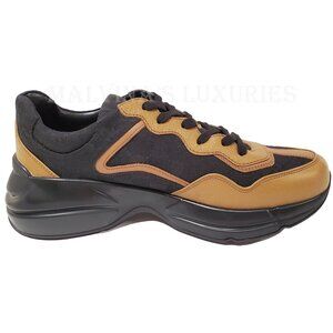 GUCCI SNEAKERS MENS RHYTON BLACK GG SUPREME BROWN LEATHER SHOES sz 8 8.5