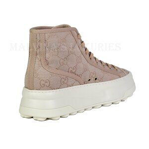 Unique Features: Crafted from tonal dark rose pink GG Supreme canvas, these high top sneakers feature a chunky rubber sole that is accented by Gucci Signature on the side and Interlocking G grip detail on soles. Grosgrain trim, lace-up closure, and G logo detail throughout.