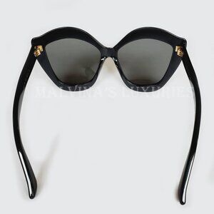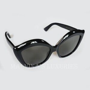 Unique Features: Oversized Cat Eye Frames, Thick Rims. Glossy Black Acetate. Molded Nose Bridge. Tinted Gradient Lenses. Goldtone Branding on Temples