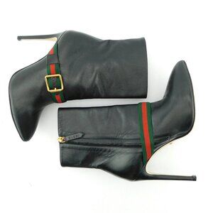 GUCCI Signature Webbed Buckle Black Leather Heeled Ankle Boots 35.5