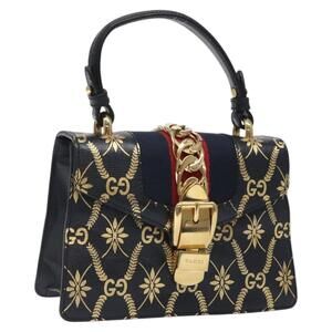 GUCCI Silvi Sherry Line Hand Bag Leather Navy Gold Red