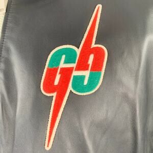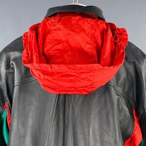 GUCCI varsity jacket in a black lambskin leather featuring a color block style with red polyamide zip away hood and sides, double GG patch, and zip up closure.