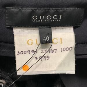 GUCCI dress pants comes in a black rayon blend jacquard material featuring a low rise, slit pockets, and a zipper fly closure. Made in Italy.