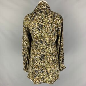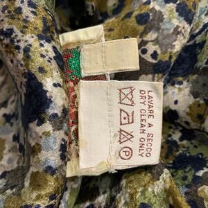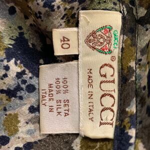 VINTAGE GUCCI 1980s long sleeve blouse comes in green and brown abstract silk print fabric with shoulder buttons and neck tie. Made in Italy.