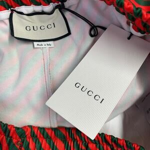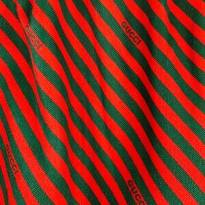 GUCCI casual pants in a red and green polyester cotton blend fabric featuring a diagonal stripe pattern, blue and cream side stripes, and drawstring closure. Made in Italy.