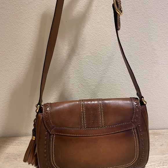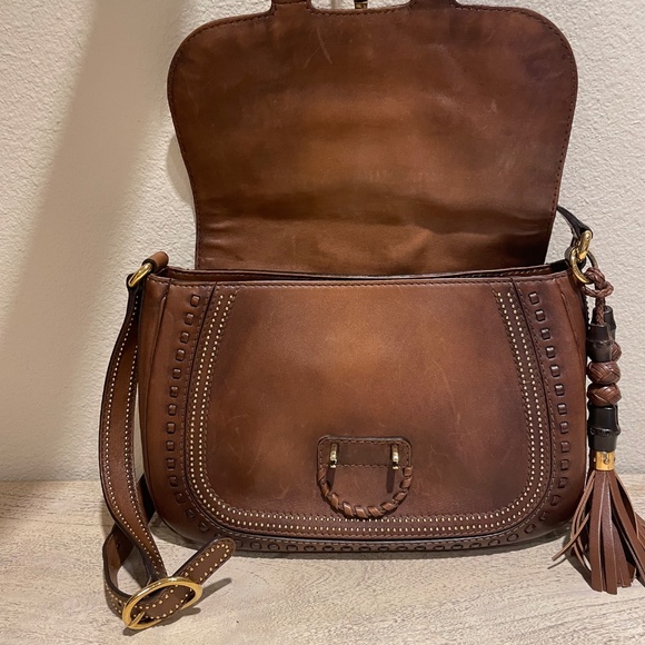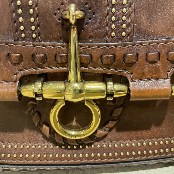Gucci Snaffle Bit bag in rich brown leather with gold-tone hardware, flat shoulder strap, stud and tassel embellishments, canvas lining, three pockets at interior; one with zip closure and push-lock closure at front flap. Approximately 11x8x3.