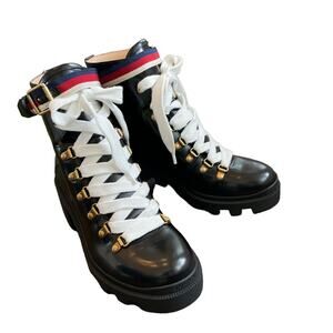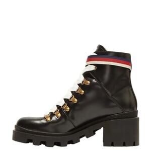 GUCCI Sylvie Leather Combat Boots Black Lace Up Grosgrain Web Women Size 38 NEW