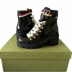 Pair them with your favorite jeans for an effortlessly chic daytime look, or add an unexpected twist to a feminine dress for a daring evening ensemble. However you choose to style them, the GUCCI Sylvie Web Combat Boots are the ultimate expression of contemporary luxury and fearless style. Embrace your inner fashion rebel and step into a world of endless possibilities with GUCCI.