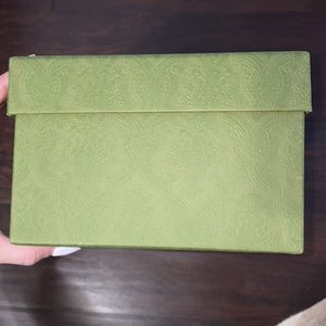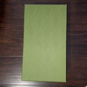 Green textured box with GUCCI on lid. Grey interior.