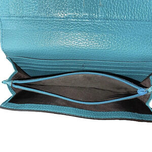 This authentic GUCCI continental wallet is crafted of textured turquoise aqua teal calfskin leather and features a front flap with a polished gold interlocking GG Gucci logo. The flap snaps opens to a compact interior with card and document slots and a zipper compartment. This classic piece is perfect for any ensemble whether dressing up or down. Suitable for any occasion, with the distinctive quality and style that is only Gucci!