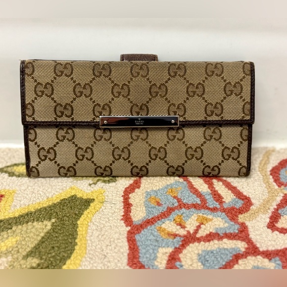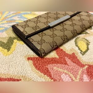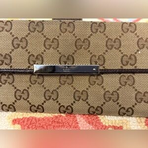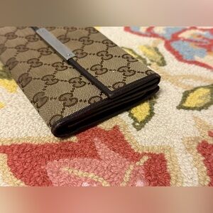 This luxurious GUCCI wallet features a brown leather and canvas design with the iconic logo. Its long, sleek profile offers ample space for cards and cash, making it a stylish and practical accessory.