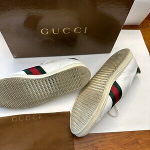 GUCCI- VINTAGE WHITE LEATHER SNEAKER-RED/GREEN STRIPES & GREEN LEATHER SIZE 38.5