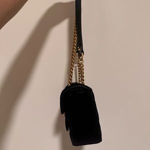 This is an authentic GUCCI Velvet Matelasse Small GG Marmont Shoulder Bag in Black. This structured bag is crafted of soft quilted velvet in black, with a heart stitched on the back. It features an aged gold chain-link shoulder strap with a black leather shoulder pad and a matching gold interlocking GG logo on the crossover flap. The bag opens with a press lock to a pink satin fabric interior with pockets.