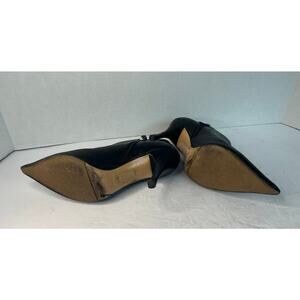 They have a narrow, pointed toe and a cutout or asymmetrical topline around the ankle. A small, silver-tone zip closure near the ankle opening for entry.