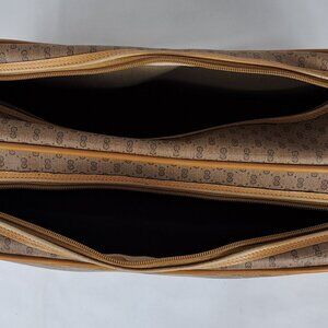 Classic travel style from Gucci. This rectangular structured bag features a coated monogram canvas exterior with tan leather trim. 2 main compartments with zip closure. One exterior pocket. Adjustable shoulder strap.