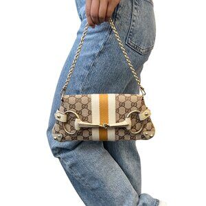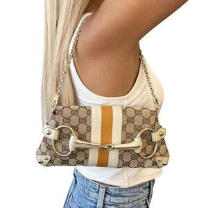 GUCCI Vintage GG Monogram Logo Horsebit Chain Shoulder Bag Brown Yellow [105662]