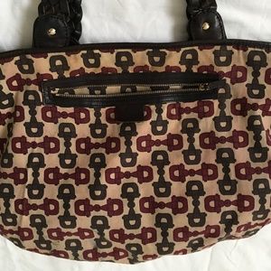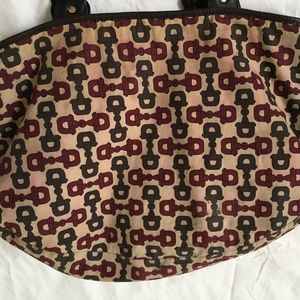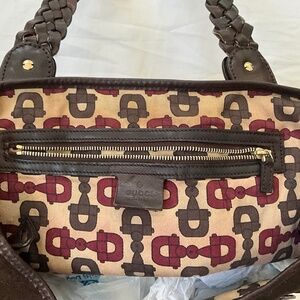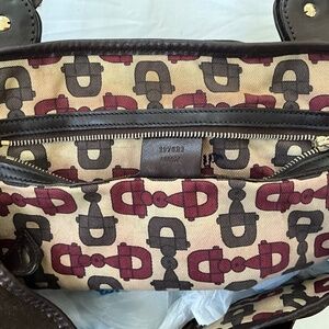 Good pre-loved condition. This vintage Gucci Pelham in brown monogram suede is structurally sound with no holes/tears, but it does show some miles! Bag can be cinched at sides with interior snap strap or left as open tote. Suede has areas of darkening/flattening of nap (mostly on lower half of bag), and some scratches throughout. Very difficult to capture this in the photos. The bag is uniformly dark brown. Some photos may show lighter areas due to use of flash. Suede could use professional cleaning and conditioning. Braided leather straps are intact with no tears. Some of the interfacing material in the braids where they attach to bag has become exposed. Could be tacked back into place if buyer finds it is bothersome. Hardware is heavy brass, still shiny with minimal tarnish and one piece with obvious scratches. There are cracks/nicks to the leather trim and eyelets of the horse bit detail, which have been touched up with leather glue/paint. Interior has been cleaned. There are light stains on the bottom lining, and some fabric dye bleeding of the Gucci pattern on the lining throughout. Please understand that this is a well-loved vintage bag. Photos show the most significant issues (zoom in on photos), but with limited photo slots I could not highlight every little flaw. Measurements and hallmarks in photos.