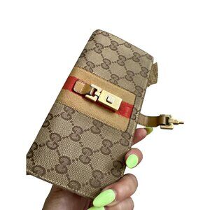 This vintage Gucci wallet features a classic striped logo design in brown and tan, offering a timeless and sophisticated look. Comes with the original box, making it perfect for collectors and style enthusiasts alike. Good condition with wear as shown from use.