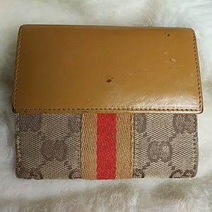 Gucci wallet with signature stripe and buckle. Inside credit card slots and bills compartments. Features 2 outside compartments withe snap closure. Couple of spots on flap but in good condition. Preworn but plenty of life left.