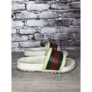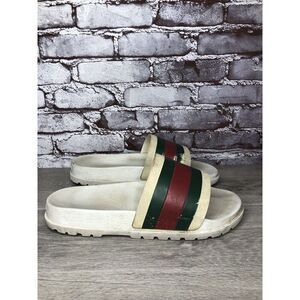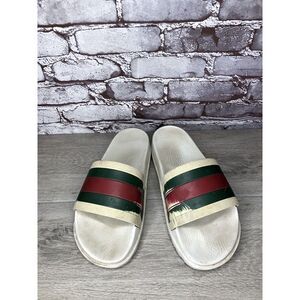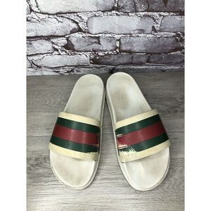 Selling GUCCI Web White Green Red Rubber Logo Casual Slides Designer Sandals Men’s Sz 11M US/44EU