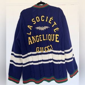 A preppy inspired silhouette, the oversize wool cardigan, features details that speak to the inspiration shown on the Cruise 2019 runway. Embroidered with crystals, the bat displayed on the back evokes the spectral setting, while the phrase "La Société Angelique" references the group of poets, writers, and scholars formed in 16th century France, during the "Lyon Renaissance," and considered to be the forerunner of literary societies. Blue wool. Green and red knit rib trim. White stripe details. On the back "La Société Angelique" Gucci patch with crystal embroidered bat patch. Gold-toned metal Double G buttons. V-neck. Patch pockets. 100% wool. Made in Italy.