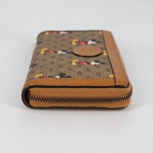 This is an authentic GUCCI X DISNEY GG Supreme Monogram Mickey Mouse Zip Around Wallet crafted of GG Supreme Monogram coated canvas with Micky Mouse printed throughout. The wallet zips open to a brown leather interior with card slots, a zipper compartment, and space for bills.