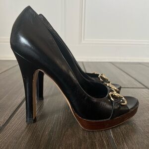 Gucci heels in black leather with gold horse bit hardware. 4” heels, sturdy, pre-loved but they’re a tad small for me so I’ve never worn them.