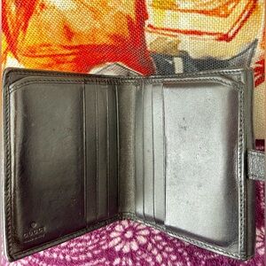 GUCCI GG small compact wallet very Luvn’ly used .. but has so much LIFE LEFT to carry her..her story is not quite over!! Distressed leather in interior pocket with lil hole where button went thru✨scratches on silver-tone hardware✨Just a lil Lvoe & she is a beauty! ~ 💯Authentic