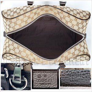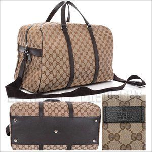 Brand New Authentic Gucci beige & brown Original GG canvas & leather BOSTON carry-on overnighter Duffel bag with shoulder strap