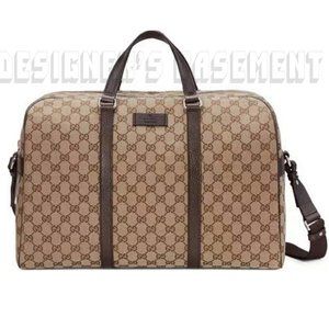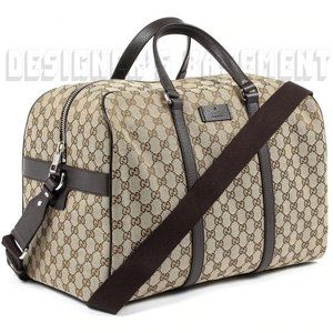 Brand New Authentic Gucci beige & brown Original GG canvas & leather BOSTON carry-on overnighter Duffel bag with shoulder strap