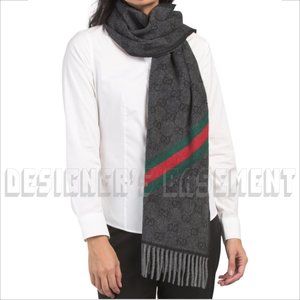 Brand New Authentic Gucci GUCCI charcoal & black GG with green and red WEB detail NIKKY angora blend fringe scarf