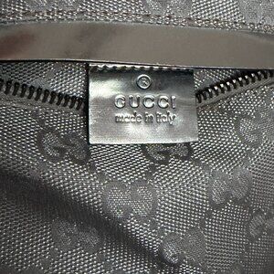 vintage GUCCI metallic silver bum bag in sparkling gg monogram canvas featuring a tonal patent leather trim, logo engraved buckle closure, web striped belt, and 3 separate compartments.