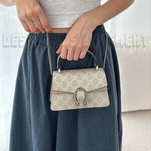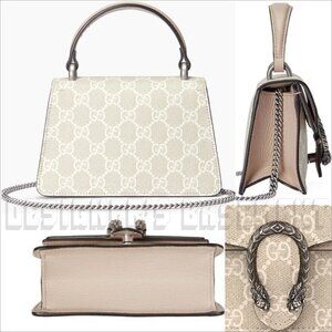 Brand New Authentic Gucci feline DIONYSUS buckle off White & Beige GG Supreme canvas and beige leather Top Handle chain strap cross body bag New In Box 🎁