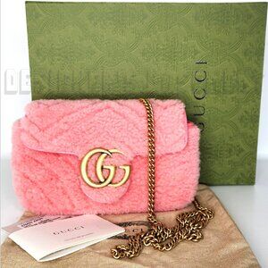 Brand New Authentic Gucci Lotus pink Shearling Matelasse GG Marmont logo buckle SUPER MINI with gold-tone chain strap shoulder/crossbody bag New In Box ๐