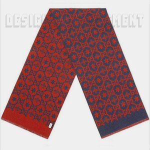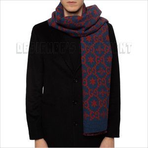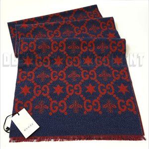 Brand New Authentic Gucci red & blue CONSTELLATION Bee GG Stars wool/silk reversible 15.5x75" large showy scarf