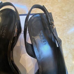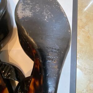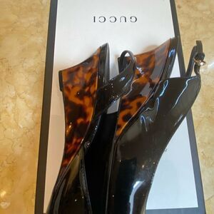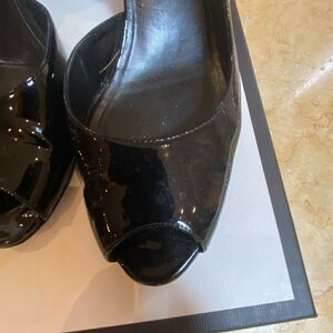 Gently worn Gucci black patent wedge with tortoise heel. Size 10.