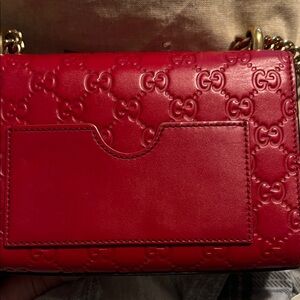 Chic Gucci shoulder bag in vibrant red leather. Features embossed logo design and gold-tone hardware. Perfect for adding elegance to any outfit.